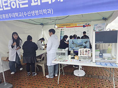 홍보부스 운영에 참여한 수산생명의학과 이도운 학생은 “평소 배우던 내용을 직접 지역 주민들에게 설명하며, 전공의 중요성을 다시 느낄 수 있었다”며, “연어 질병 진단 체험을 통해 아이들과 가족들이 수산질병관리 분야에 흥미를 가지는 모습을 보며 보람을 느꼈다”고 전했다.