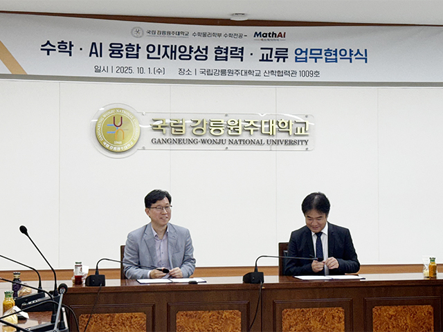 우리대학 수학물리학부(학부장 손성익) 수학전공은 10월 1일(화), 인공지능 전문기업 MathAI(주식회사 매쓰에이아이)와 수학·AI 융합 인재 양성 협력·교류를 위한 업무협약(MOU)을 체결했다.