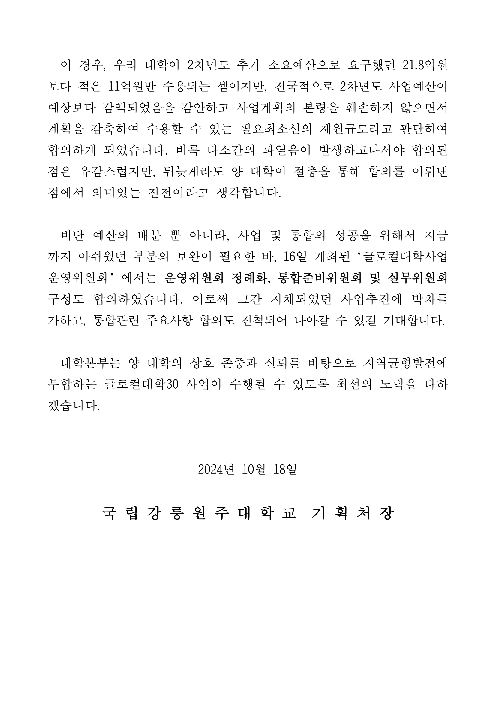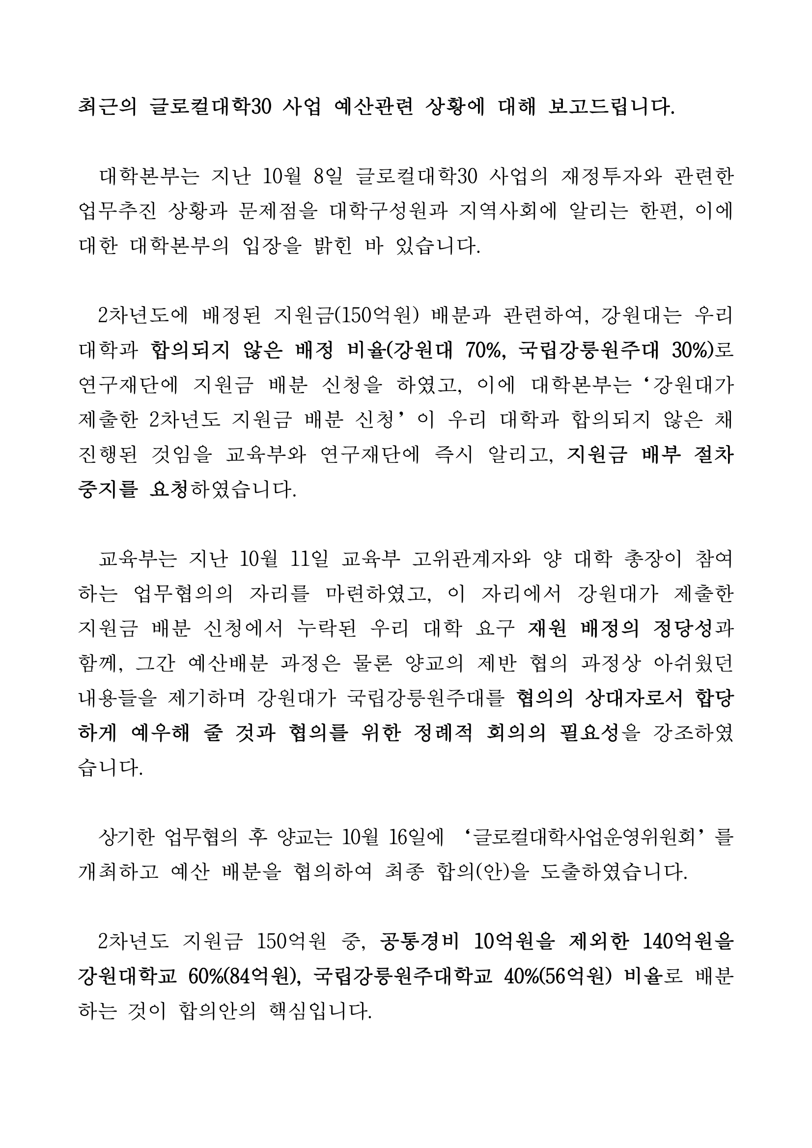 글로컬대학30사업 예산 관련 상황에 대해 보고 드립니다.